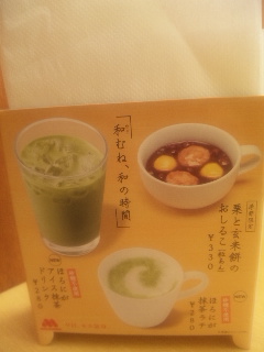抹茶ラテやおしるこがある。おしるこおいしそうだな~。おやつを食べに来るのもいいかも。